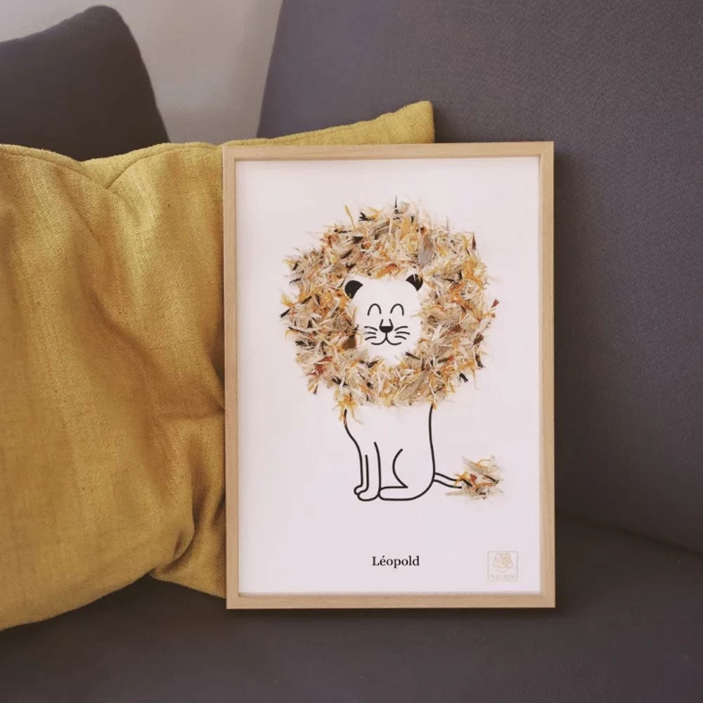 Notre herbier Siméon le lion est une idée de cadeau de naissance ou de décoration de chambre d’enfant original et durable. Taille : format A4 21*29,7cm . 2 attaches prévues au dos pour l’accrocher