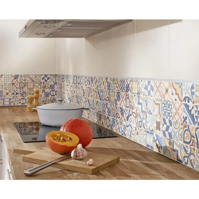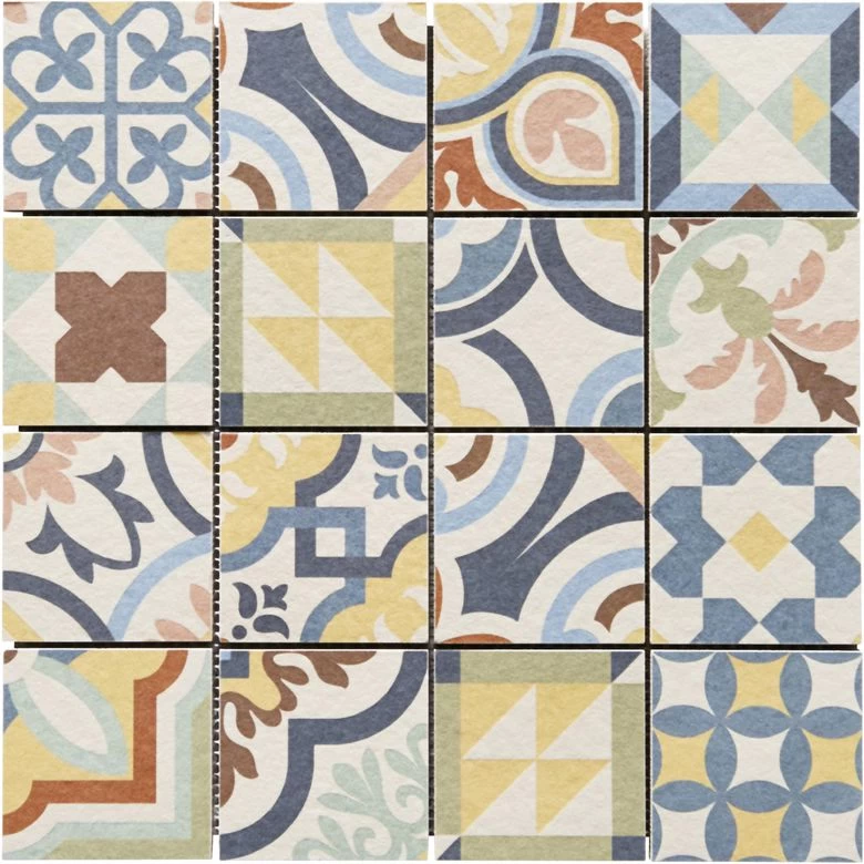 Un carrelage mosaïque qui reprend l’aspect carreau de ciment en motifs patchwork pour réaliser de nombreux dessins personnalisés sur tout support de cuisine ou salle de bains, ou sol de pièce à vivre.