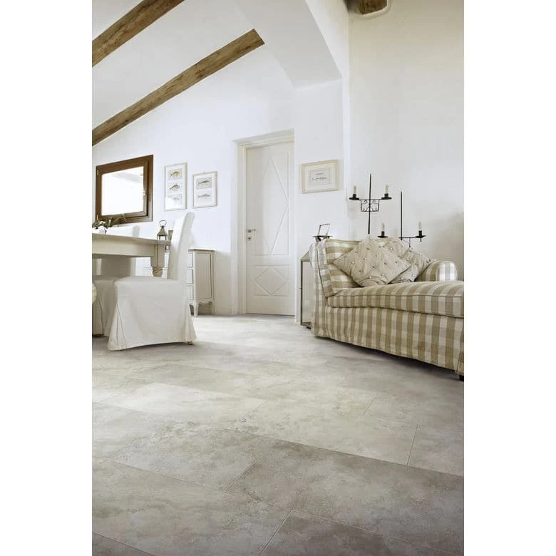 Un carrelage en grés cérame émaillé antiglissant, effet pierre nuancée en impression digitale, pour créer une ambiance minérale naturelle sur sol, mur et plan de travail de votre cuisine.