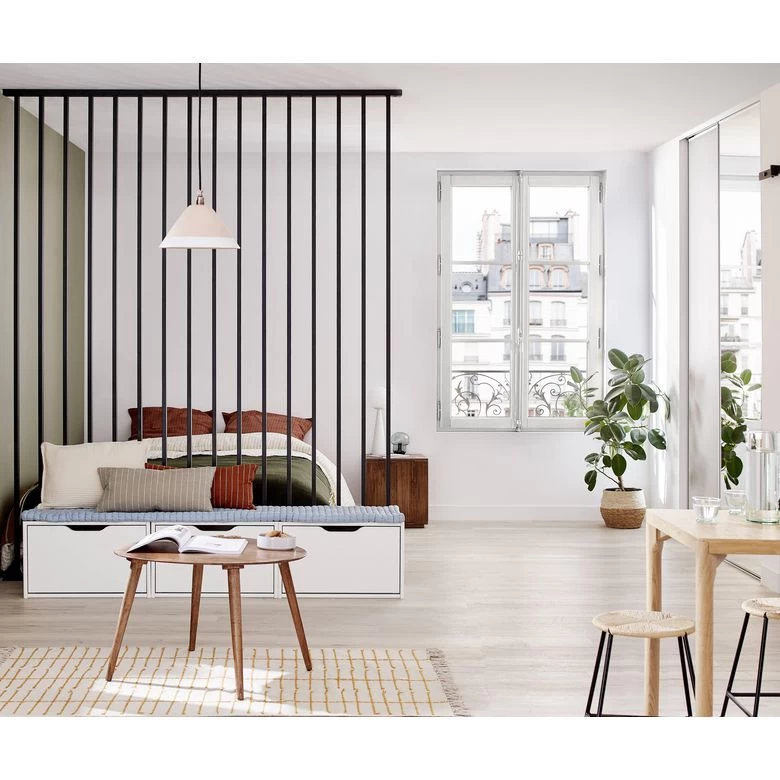 – Cloison / balustrade qui peut être utilisée comme séparation de pièce ou comme garde-corps à l’étage. Sa solide structure en acier évite aux enfants d’écarter les fuseaux et d’assurer ainsi leur sécurité.