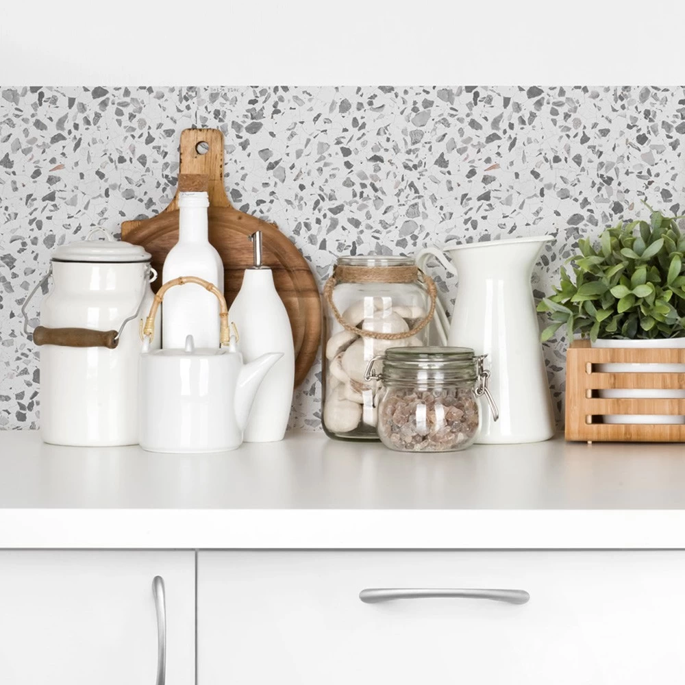 Envie d’apporter une touche de couleur tout en finesse dans votre cuisine et l’embellir ? Optez pour les crédences adhésives Beija Flor qui reprennent les fameux motifs tant apprécié le terazzo ! Ces crédences se positionnent facilement sur un carrelage, des carreaux en faïence égalisés, un mur lisse ou une surface plate et habillent en un tour de main votre espace. Vous protégerez par la même occasion vos murs et éviterez ainsi les projections d’eau. Vous pourrez facilement nettoyer votre crédence d’une éponge humide.