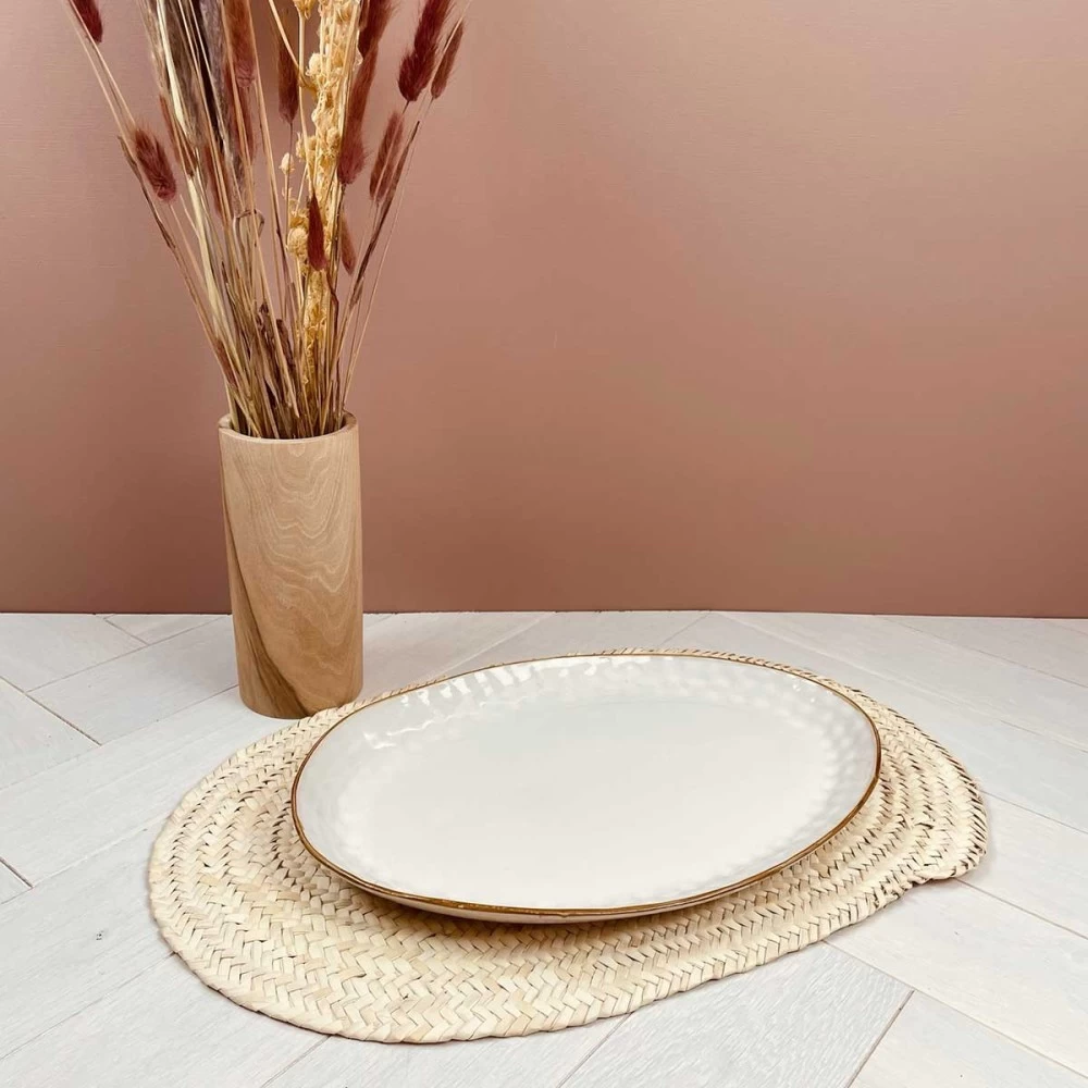 Pour habiller votre table d’une touche naturelle, ce dessous de plat typique Marocain fabriqué à partir de fibres de palmier est très original. Il peut être utilisé en centre de table en revanche, il est moins résistant à la chaleur que le modèle dessous de table rond en raphia. On craque pour le style ethnique et bohème chic de ce centre de table sous cette forme ovale de largeur 45 cm.