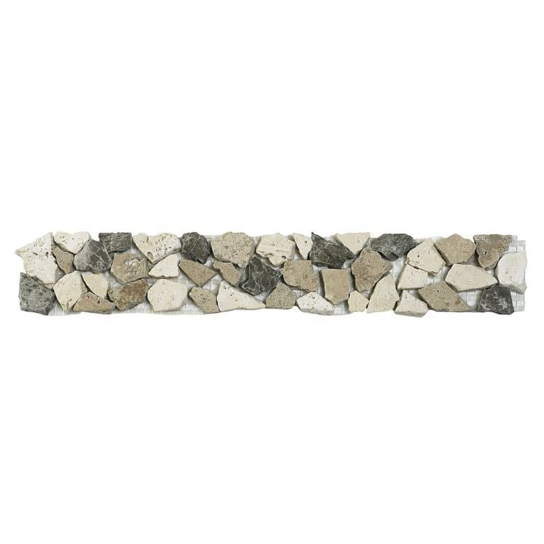 Un listel de murs en plaque de galets naturels à poser sur mur et sol pour une frise qui apporte une touche naturelle pour une ambiance salle de bains zen.