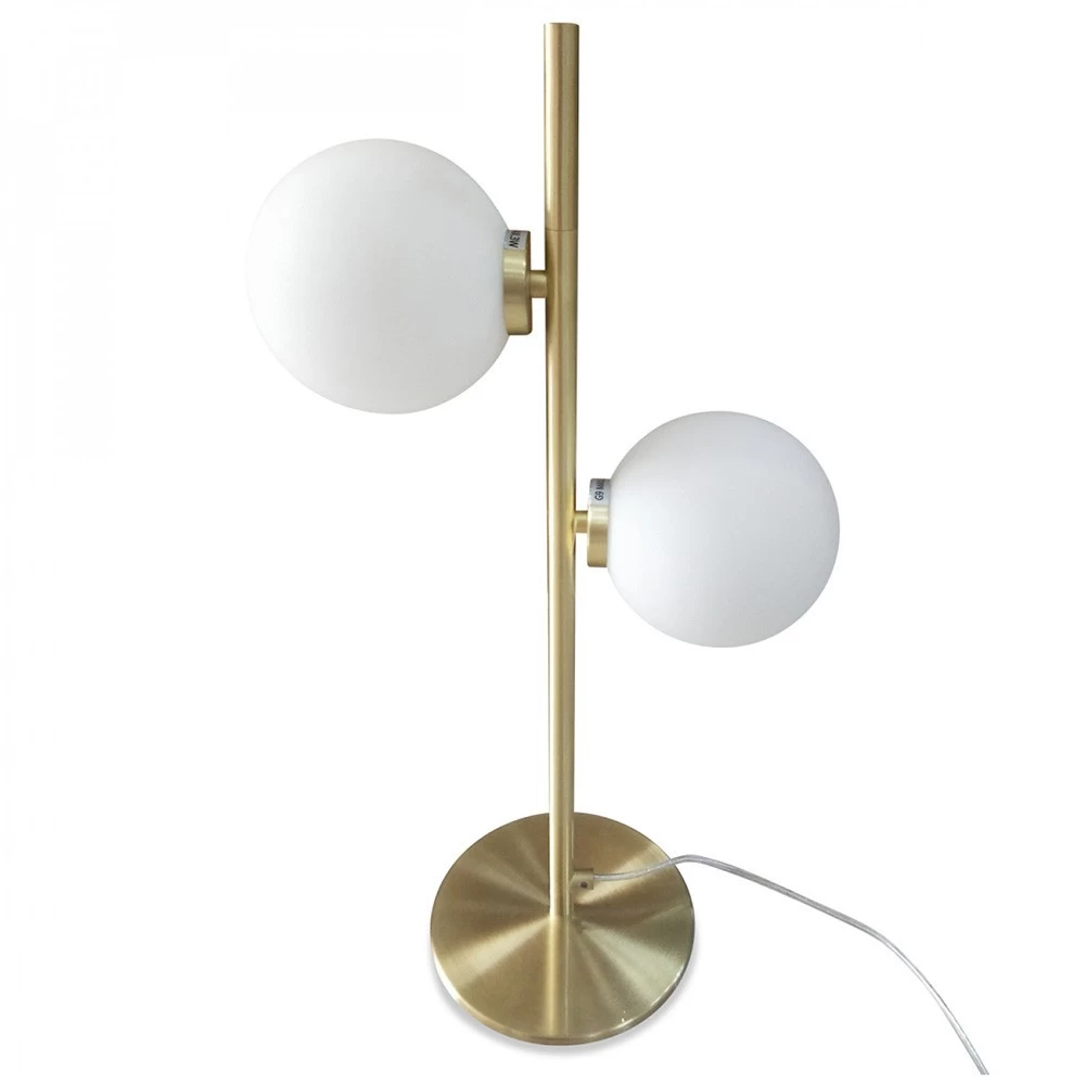 Lampe 2 globes en verre blanc – avec base et structure dorée satinée H. 53 cm