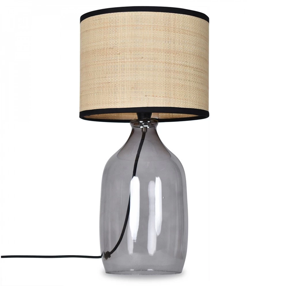 Lampe à poser en verre fumé noir et abat-jour raphia. Type E14