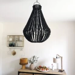 Luminaire importé de Bali avec armature métal noir et perles bois coloris Noir