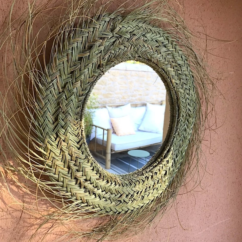 Grand miroir artisanal en fibres alfa tressées (graminée que l’on retrouve au Maroc) ♡ Sous un patio, sur les murs de la chambre ou du salon, dans une entrée, il sera la touche lumineuse et bohème…
