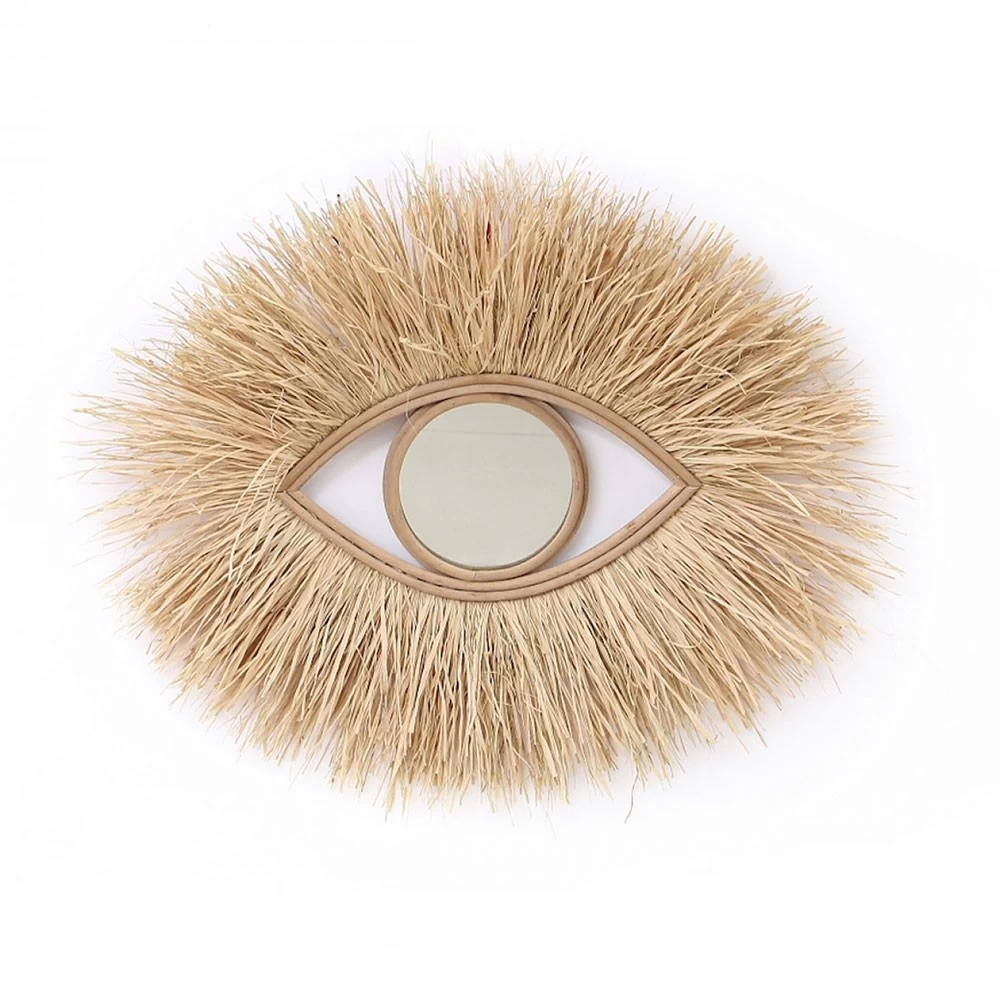 Miroir naturel avec franges en raphia et tressage – Création d’artisanat marocain