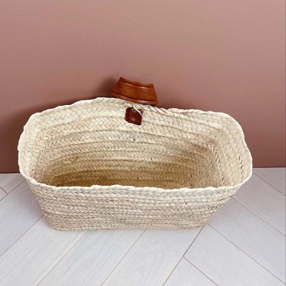 On adore ♡ ce joli panier en palmier tressé à la main par notre artisan marocain. Il est joliment fini avec une anse en cuir marron que l’on peut suspendre à une patère ou un crochet.