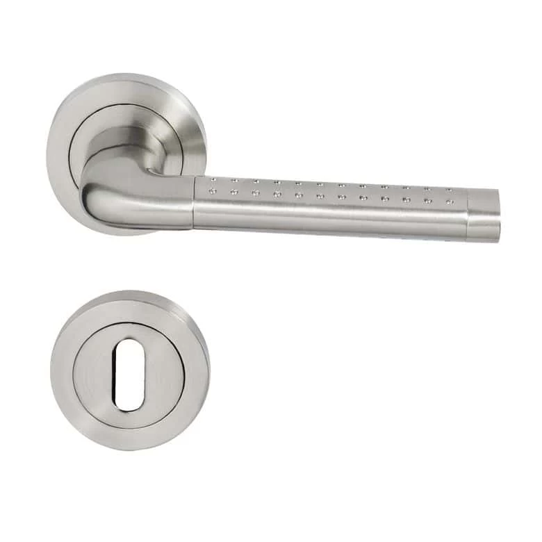 Apportez une touche de décoration à votre porte intérieure grâce à la poignée Arena en chromé satiné et à rosace à condamnation.