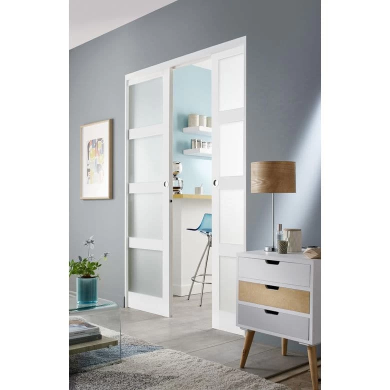 Découvrez sans attendre le style contemporain de cette porte coulissante laquée blanc. Fabriquée en bois résineux et recouverte de 2 faces MDF, cette porte coulissante à vitrer dispose d’un joint antivibration. Elle se coordonne harmonieusement avec le bloc-porte de la même collection. Cette porte est réalisée dans nos usines en France.