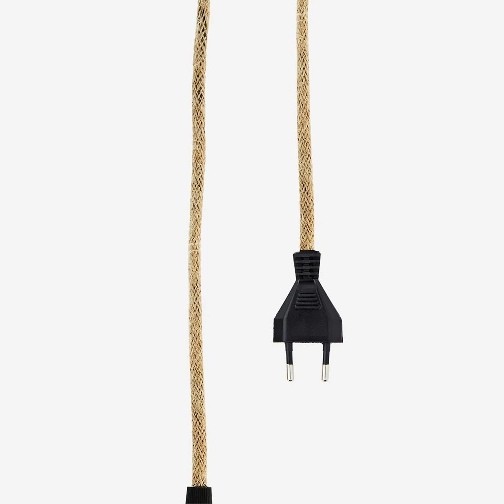 Cette applique dispose d’un cordon tressé en fil de jute couleur naturelle et d’une longueur de 3 m pour les grandes hauteurs sous plafond à brancher sur une prise de courant. Existe aussi en version noire (nous contacter)